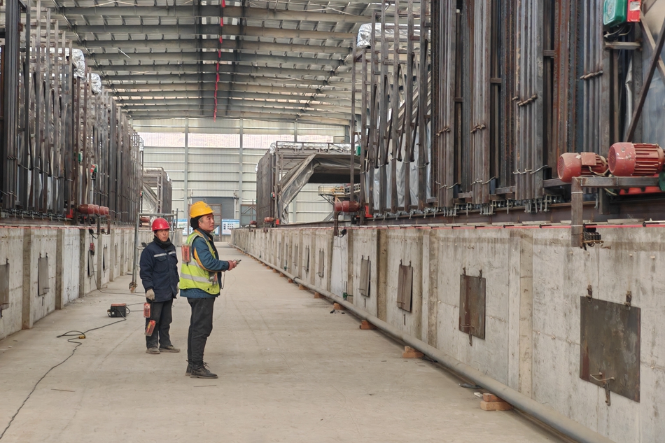 作为项目建设负责人,梁彦红每天都要穿梭于施工现场,忙碌在施工程序、人员管理、安装验收等多个环节,进行全流程的监督管理,全力保证设备安装调试高标准、高质量完成。“2#冶炼生产线目前保温料已经装完,我们两台行车在装炉,工人们正在紧张有序施工,混料系统正在调试设备,目前已经调试完成。”