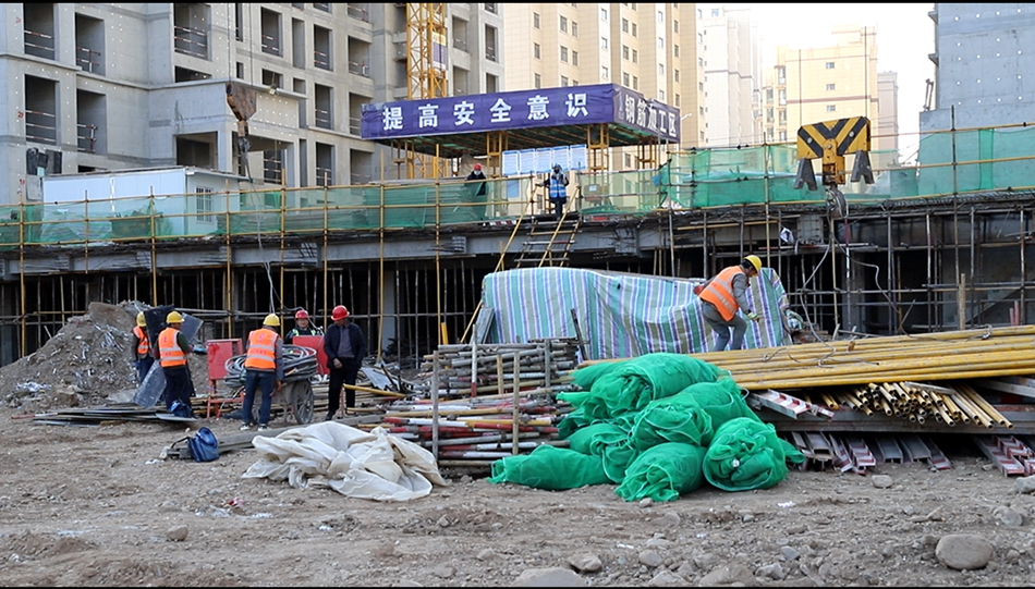 施工现场,工人们头戴安全帽,11#12#楼正在进行梁板钢筋绑扎,模板支设、悬挑外架搭设,后台钢筋制作加工,各类器械运转不停,一派火热的景象。