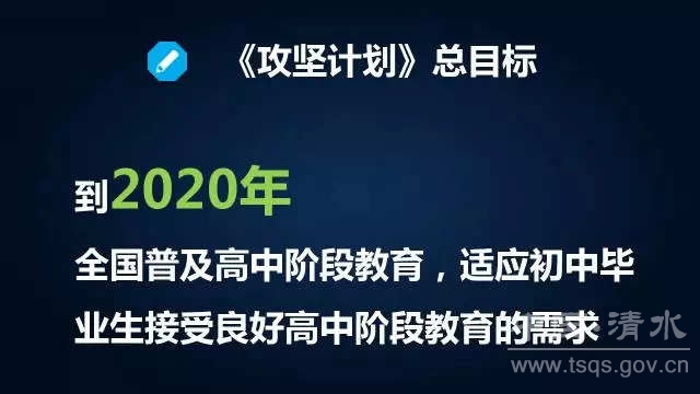 4月6日上午,教育部召开新闻发布会,介绍《高中阶段教育普及攻坚计划(2017-2020年)》有关情况。教育部基础教育司司长吕玉刚在发布会上介绍,《攻坚计划》的总目标是到2020年,全国普及高中阶段教育,适应初中毕业生接受良好高中阶段教育的需求。