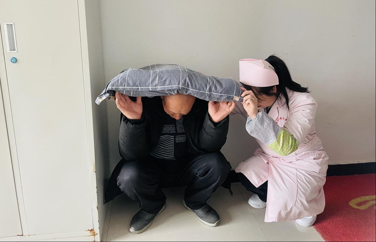 此次演练围绕应急响应、人员转移、救援行动等关键环节开展。随着预警铃声响起,演练正式开始,工作人员迅速按照应急预案,协助老人用枕头保护头部就近躲在桌下、墙角等安全区,进行紧急避险。“紧急疏散”信号发出后,工作人员帮助老人沿着预定疏散路线,快速向室外安全区域转移,整个演练过程紧张有序、有条不紊、圆满完成。