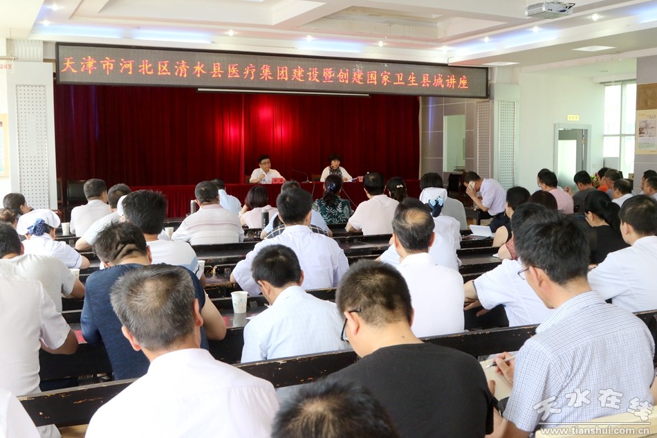 7月26日下午,天津市河北区清水县医疗集团建设暨创建国家卫生县城讲座在清水县人民医院举办。天津市河北区卫生计生委党委副书记、主任苏宏为清水县医疗体系的科学构建和创建全国卫生县城进行传经送宝。讲座由清水县人民政府副县长李宝玲主持。