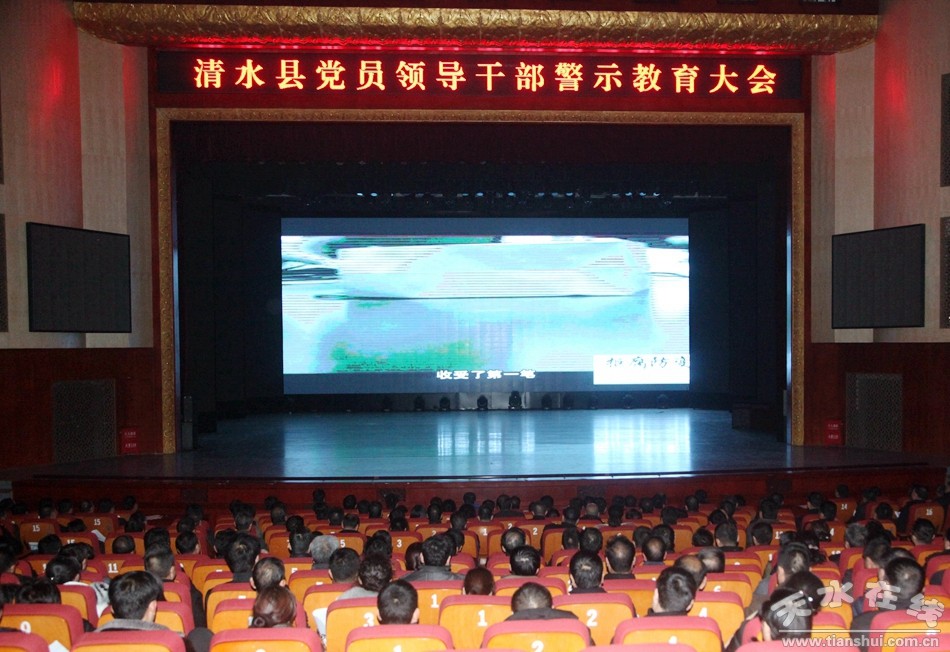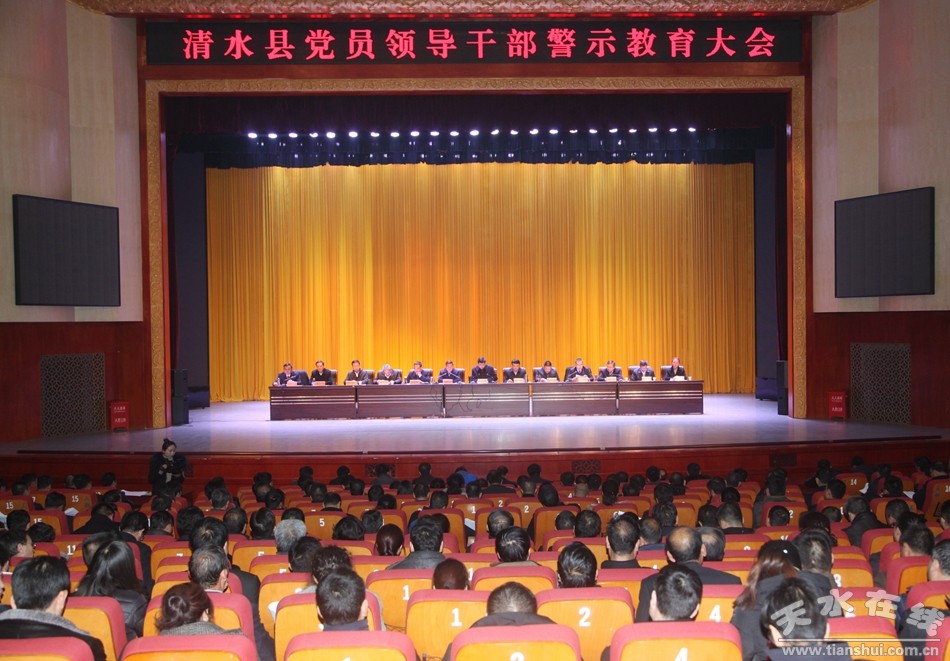 12月24日晚,清水县召开党员领导干部警示教育大会,深入学习贯彻落实党的十九大精神和省、市领导干部警示教育大会精神,落实全面从严治党主体责任,推动全面从严治党向纵深发展。县四大组织在家领导出席会议;18乡镇党委书记、乡镇长、纪委书记,县直各部门、省市驻县各单位主要负责人、纪委书记,县人大代表、政协委员中的党员,共计300余人参加了会议。