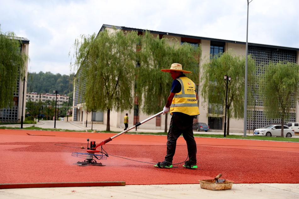 近日,记者来到清水县第八中学,工程队正在紧张有序铺设人工草坪、塑胶跑道等,大家相互配合现场井然有序。