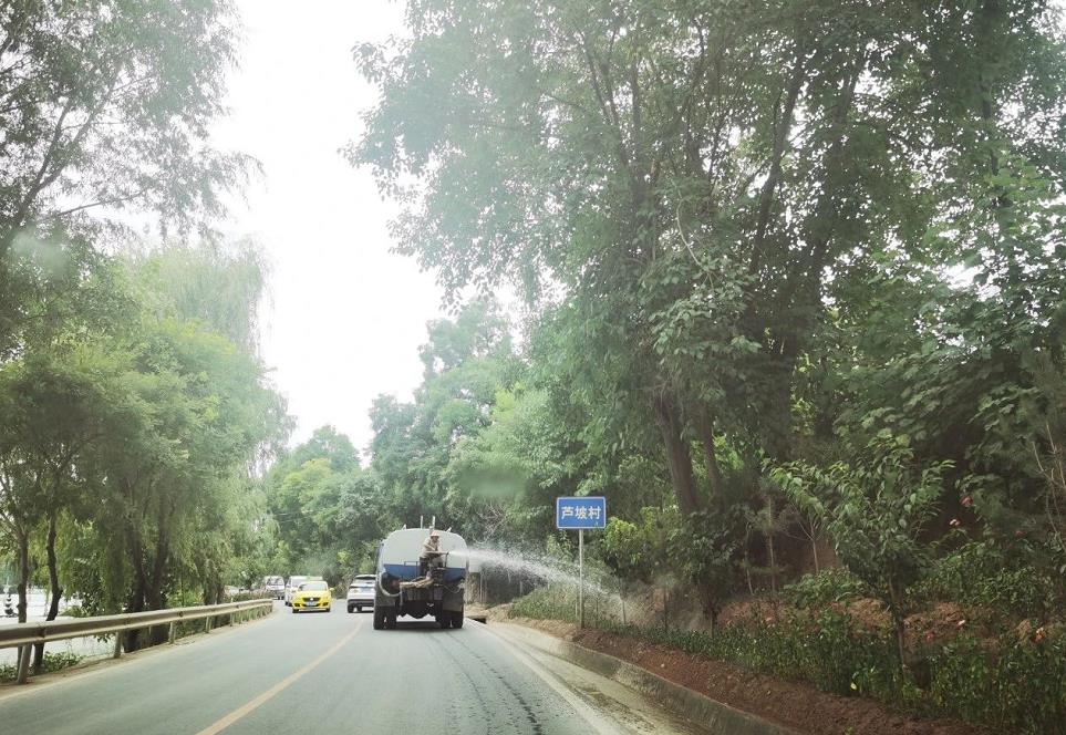 二级路、桐温路沿线行道树、花带整修、浇水