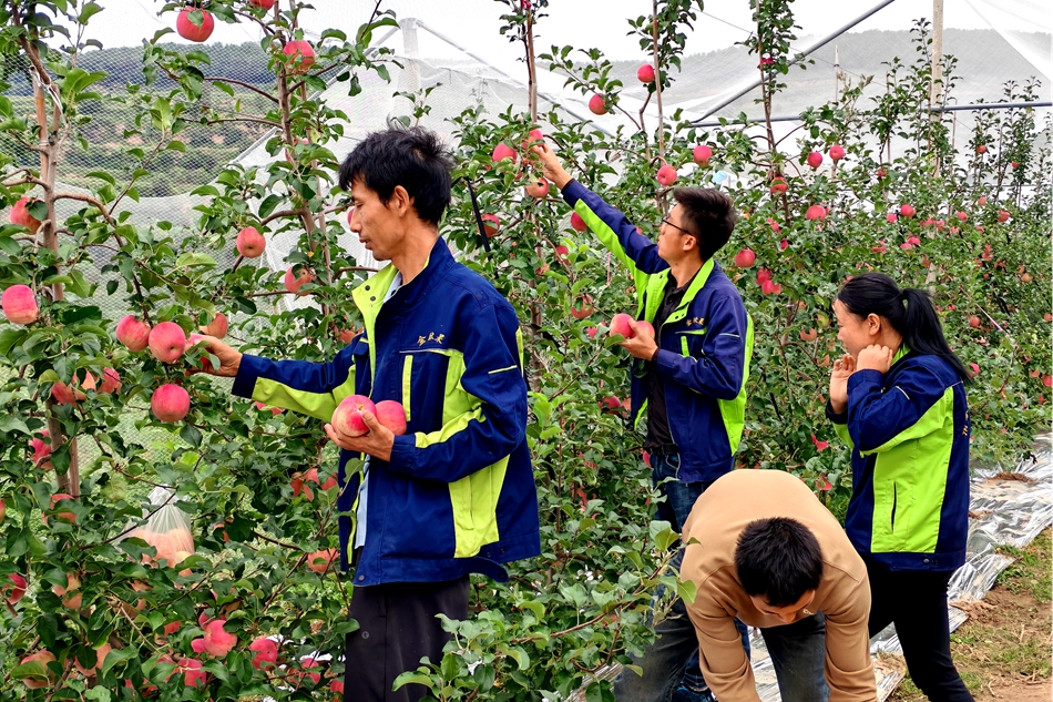 来到金集镇矮砧密植苹果示范园,一颗颗鲜红透亮、饱满圆润的苹果挂满枝头,空气中弥漫着清甜的果香。果农们正有条不紊地忙碌着采摘、分拣、装箱、搬运,现场一片丰收的景象。