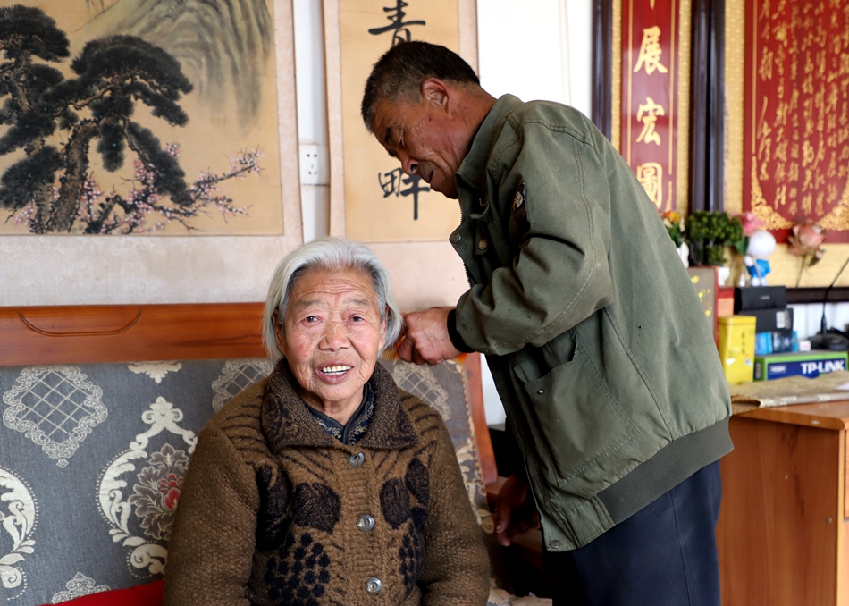 在村民何建林家中,何建林正在给父母洗衣服。父母都是已年近90岁高龄的老人,在何建林的悉心照顾下,父母身体康健。他还经常给母亲梳头、陪父母聊天,是李湾村孝顺老人的典范。