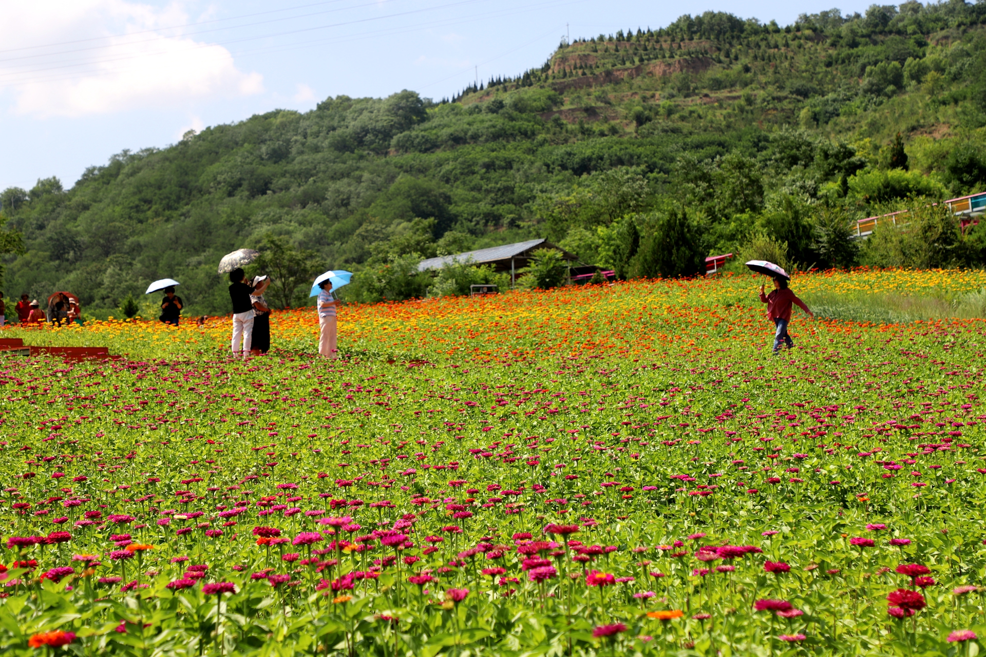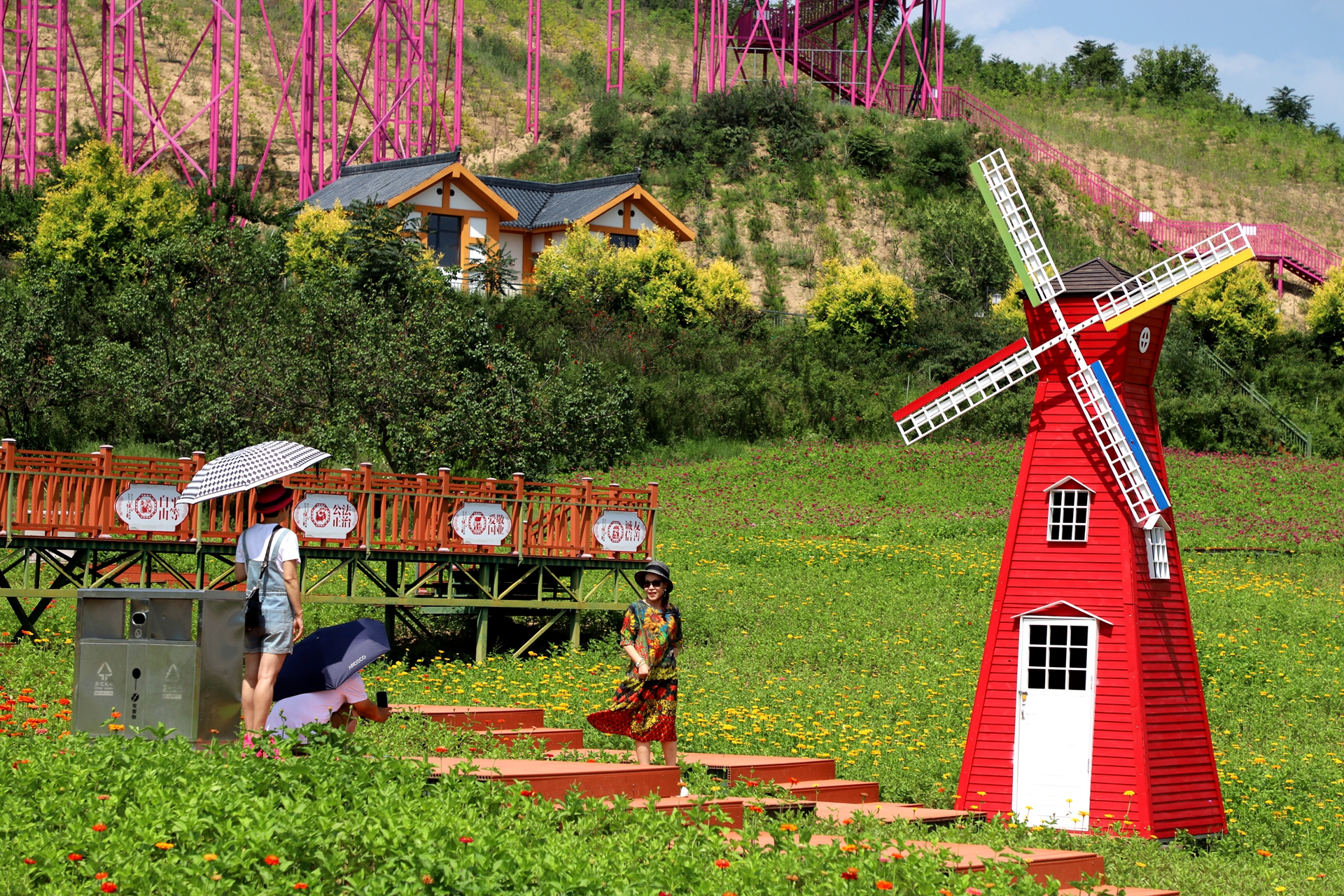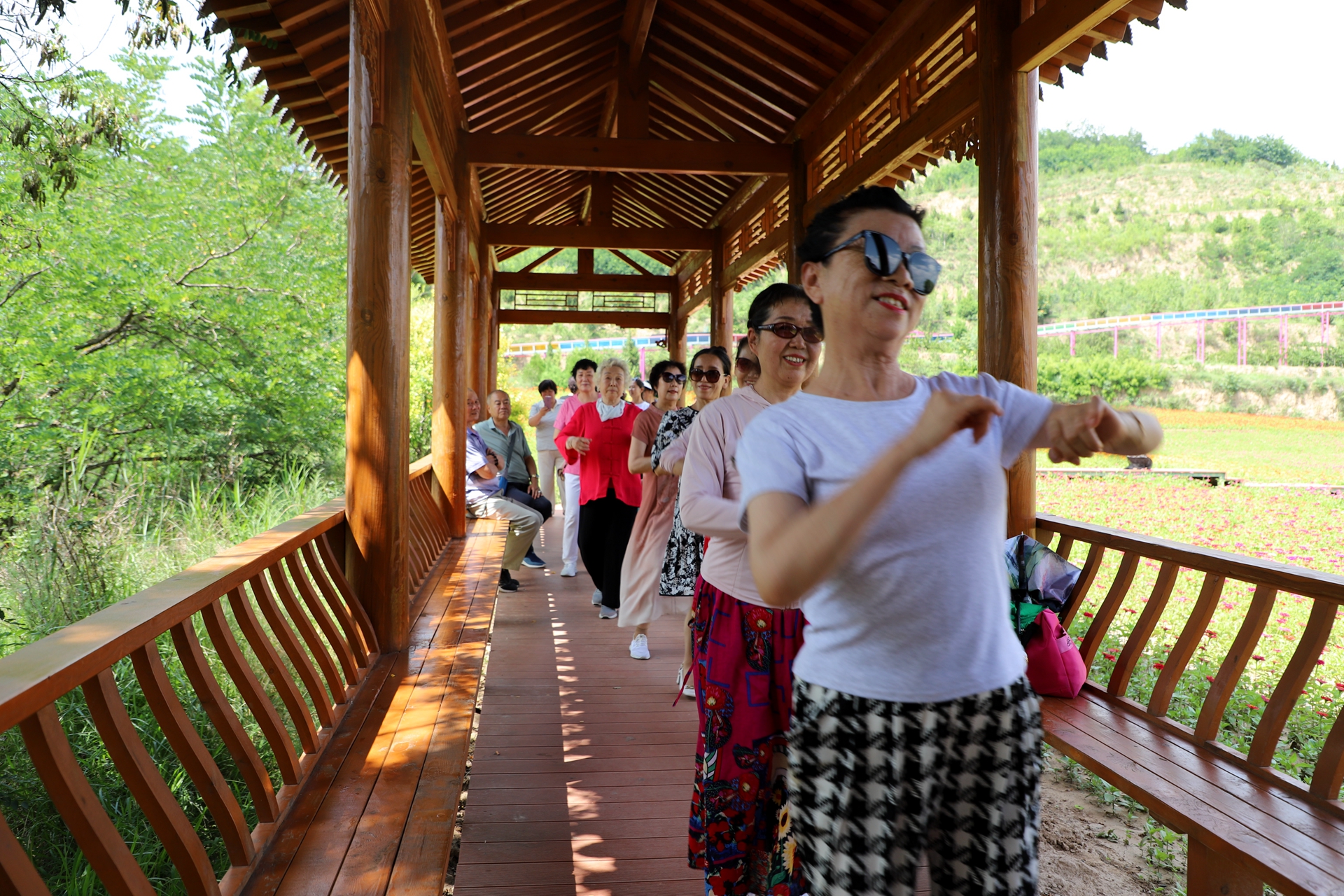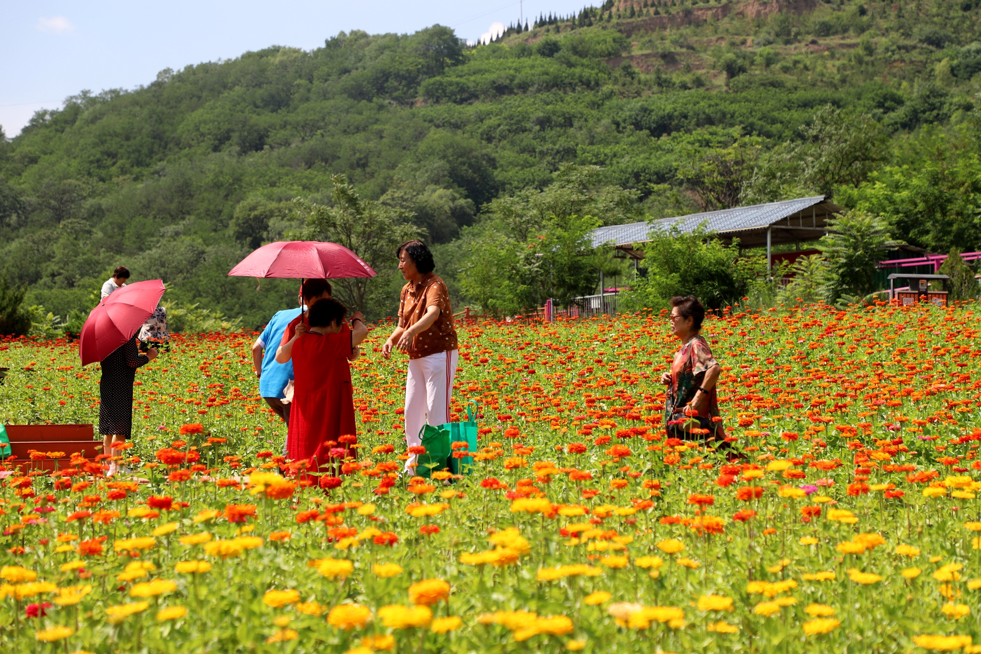 随后,游客们乘坐旅游大巴来到了北山生态景区,这里的夏花开得正盛,五颜六色、鲜艳夺目,仿佛一片花的海洋。红的、黄的、粉的,各种颜色的花朵竞相绽放,微风拂过,花海泛起层层波浪,还散发着阵阵清香,令人陶醉。游客们穿梭在花丛中,有的凑近花朵细细观赏,有的与鲜花合影留念,有的不禁跳起舞来,感受着大自然的美好与馈赠。