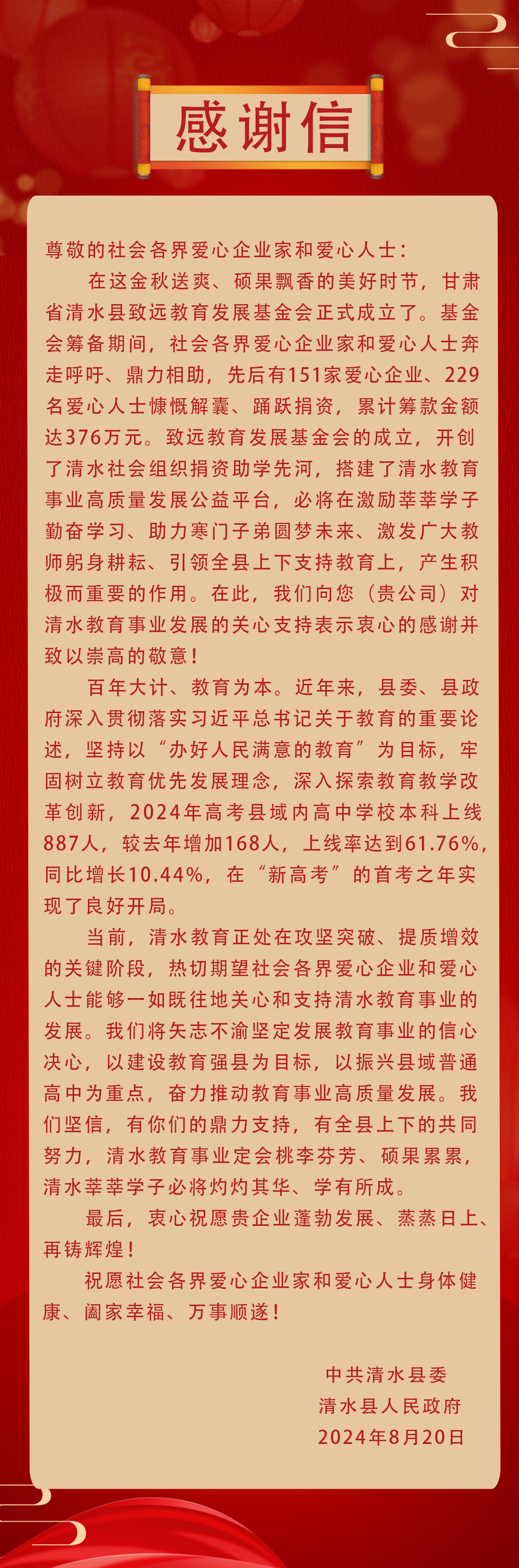 一封来自中共清水县委 清水县人民政府的感谢信