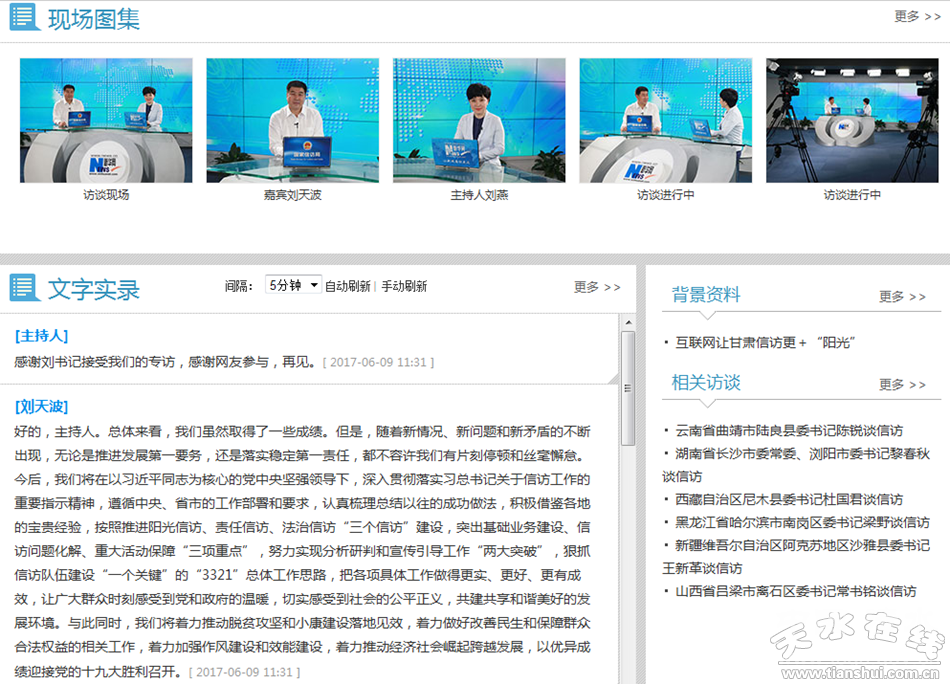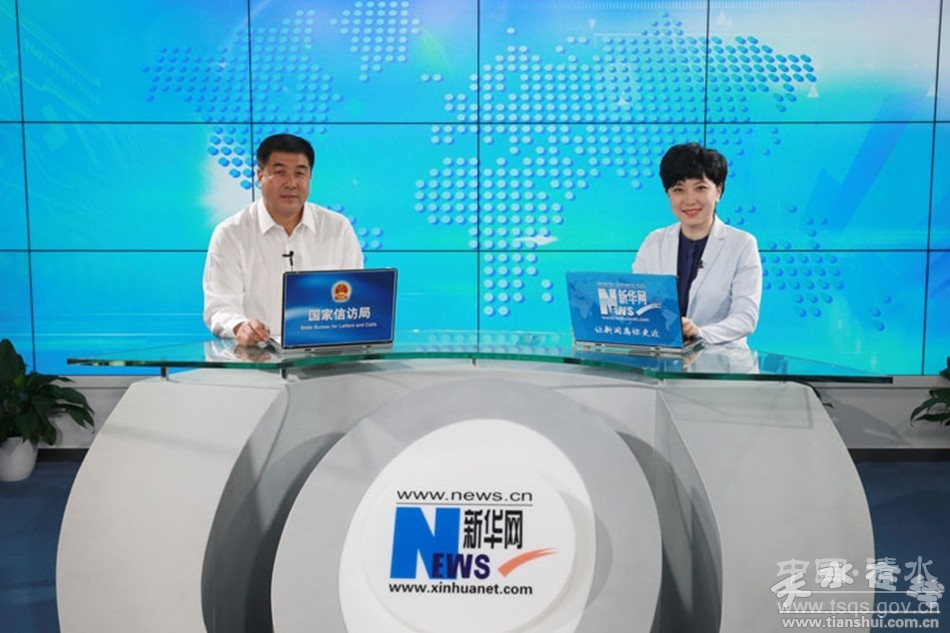 6月9日,由国家信访局、新华网联合推出的“县委书记谈信访”系列访谈进行第二十五期访谈,天水市人大常委会副主任、清水县委书记刘天波受邀接受了新华网采访,就清水县贯彻落实中央关于信访工作制度改革和信访法治化建设的决策部署过程中的探索创新、基层信访工作取得的主要成效和经验做法与网友进行了面对面的交流。 上午10时,访谈在新华网演播厅准时开始,在一个半小时的访谈时间里,刘天波同广大网友分享了清水县在基层信访工作中的典型做法和先进经验。据了解,本期“县委书记谈信访”系列访谈是此次访谈中的最后一期,天水市人大常委会副主任、清水县委书记刘天波也是本次访谈中受邀的甘肃省唯一一位嘉宾,天水市信访局局长蔡虎林随同参加。