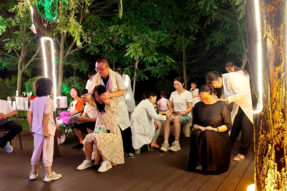 8月6日晚,清水县轩辕湖畔樊河桥边人潮涌动、热闹非凡,中医药文化养生夜市吸引着越来越多的群众前来咨询体验。伴随着夜幕降临,身穿白大褂的理疗师们化身“夜市摊主”,为这个夏夜带来不一样的“烟火气”。
