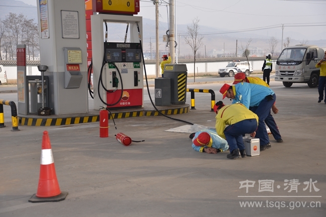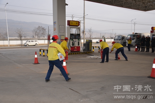 11月25日,清水县在城关加油站举办危险化学品事故应急演练,副县长马小平出席活动,安监局、消防大队、卫计局、交警大队、工商局、质监局。商务局、永清镇安监站、红堡镇安监站、黄门镇安监站、城关加油站、红堡加油站、永清加油站、牛头河加油站、黄门加油站。陈华液化气供应站、天水惠方养殖加工有限公司相关人员参加应急演练。
