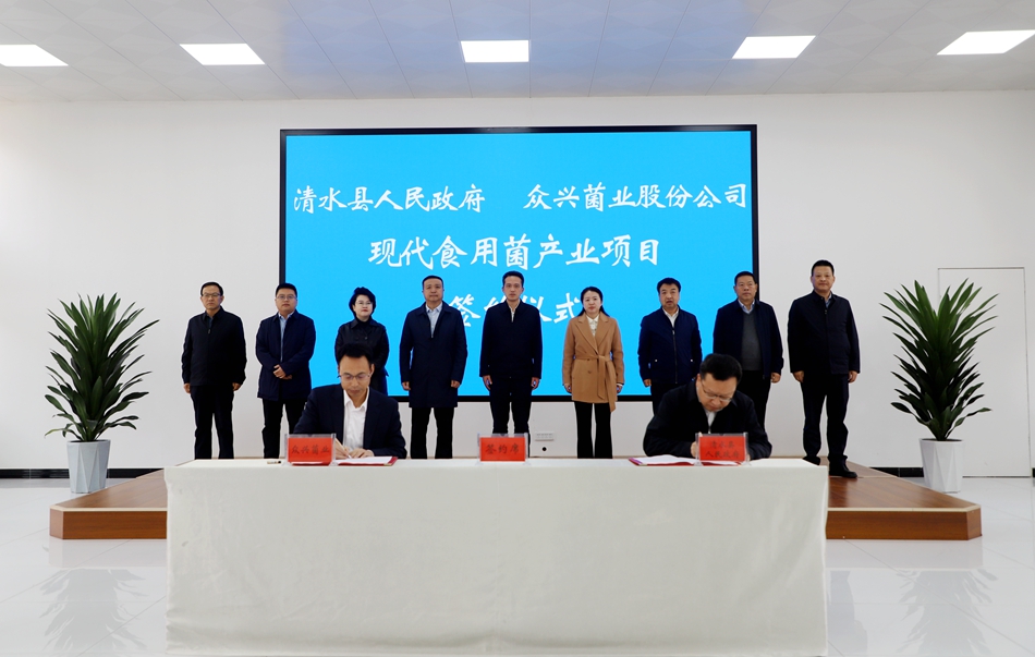 10月18日,清水县人民政府与天水众兴菌业科技股份有限公司签订现代食用菌产业项目投资协议。副市长储著贞、天水众兴菌业科技股份有限公司党委书记陶军出席签约仪式,清水县委书记李菊霞出席签约仪式并致辞,天水众兴菌业科技股份有限公司总经理刘亮介绍了项目情况。县委副书记、县长王涛主持签约仪式并与天水众兴菌业科技股份有限公司总经理刘亮签订投资协议书。县领导丁旺喜、蔡俊杰等出席。
