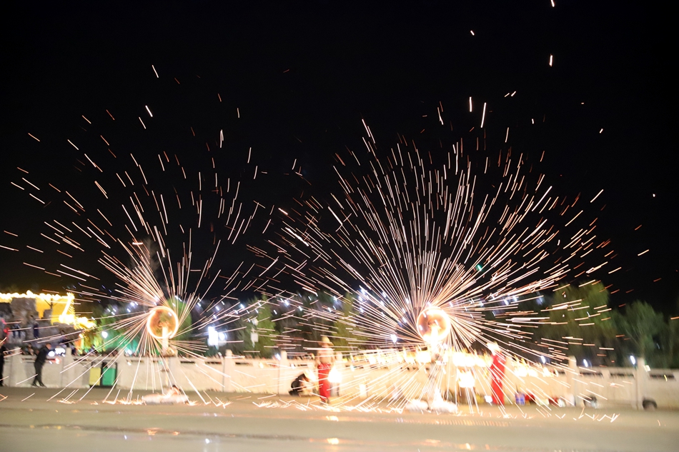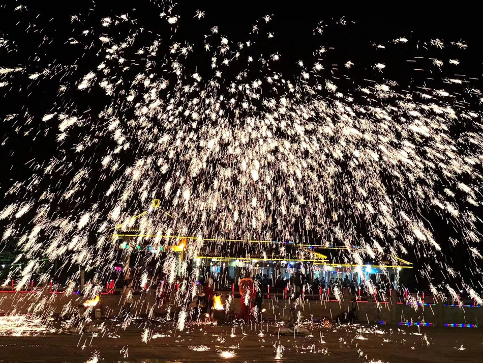 表演现场,一串串耀眼的铁花在空中散开,璀璨夺目、绚丽震撼。铁花冲破漆黑的夜空绽放,像满天繁星雨点般落下,如流星滑落般令人惊艳,万千火花瞬间四散开来,寂静的夜空被立刻点亮。