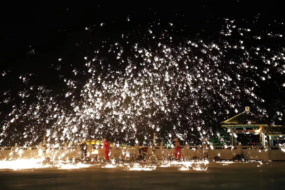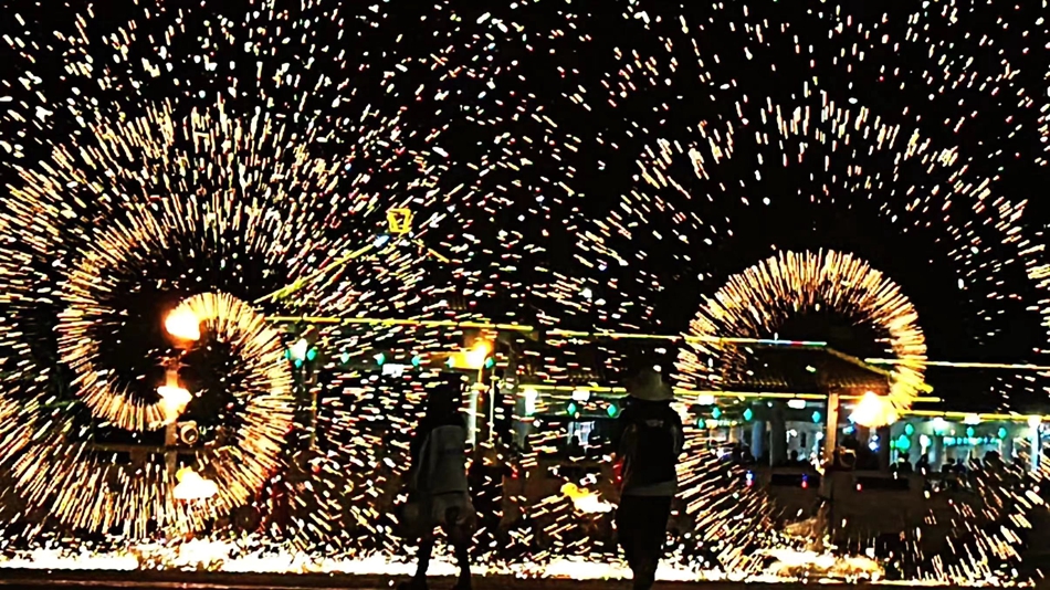 身怀绝技的非遗匠人们手持花棒,先将一勺勺通红的铁水洒向天空,接着挥舞手中的花棒。在花棒的击打下,铁水冲向天空迸散开来,瞬间在空中炸开化为绚烂铁花。流星如瀑、光芒四射、声震天宇,引得游客惊叹连连。