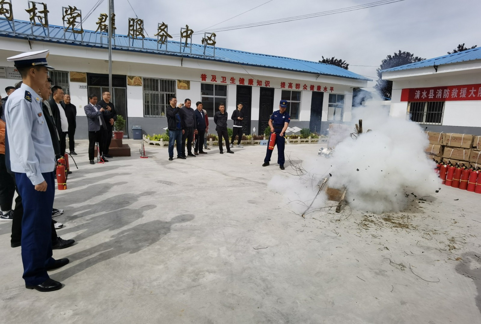 配发仪式开始,交接了配发器材,为14村分别配发灭火器15具,消防水带10盘,水枪1把,水带接口10副,为镇政府配发灭火器70具。消防大队工作人员向14村书记演示操作了消防器材的使用方法,并针对如何灭火开展了面对面的培训,同时开展了消防安全知识宣讲,发放了消防安全宣传海报,并现场点火,开展了实操演练。14村书记分别现场操作灭火器进行灭火,掌握了灭火技术,培训取得实实在在的效果。