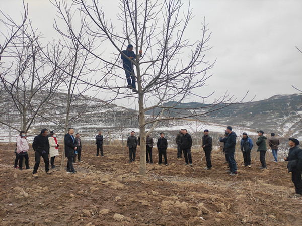 “大家在修剪早熟品种的核桃树时,要注意培养树形,早春期咱们主要是剪掉干枯枝条,及时控制背后枝......”驻杨李村的果业中心干部杨会光在黄门镇小河村核桃园里,为村民们讲解春季核桃修剪整形技术。确保村民们在新的一年里能够有好的收成。